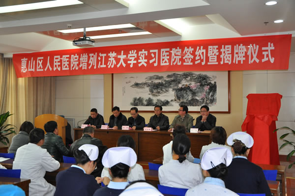 日前,无锡市惠山区人民医院正式挂牌江苏大学实习医院,签约揭牌仪式在惠山区人民医院举行。惠山区卫生局领导、惠山区人民医院全体院领导、中层干部,江苏大学医学部、教务处及临床医学院相关领导出席了签约揭牌仪式。