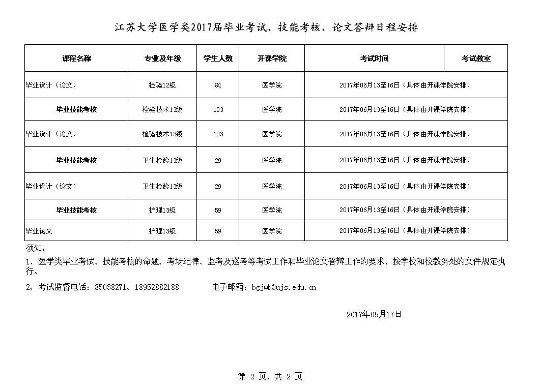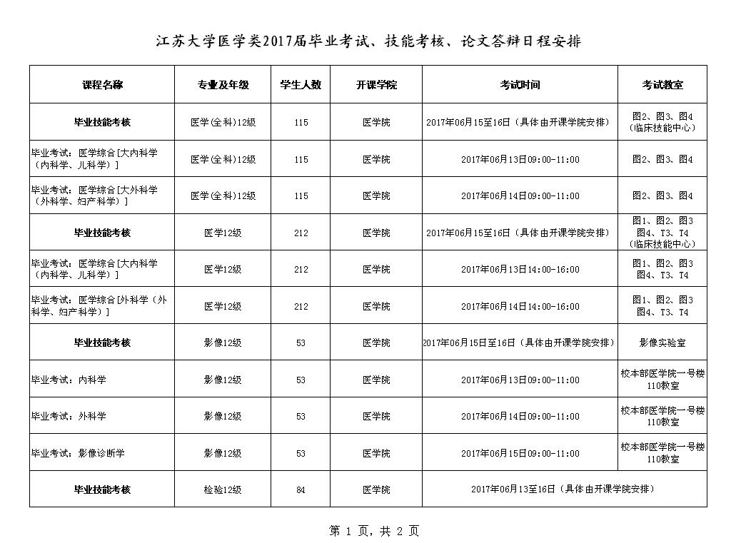 江苏大学医学类2017届毕业考试、技能考核、论文答辩日程安排