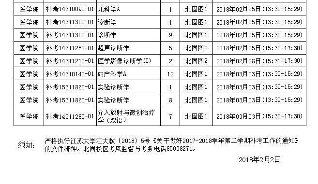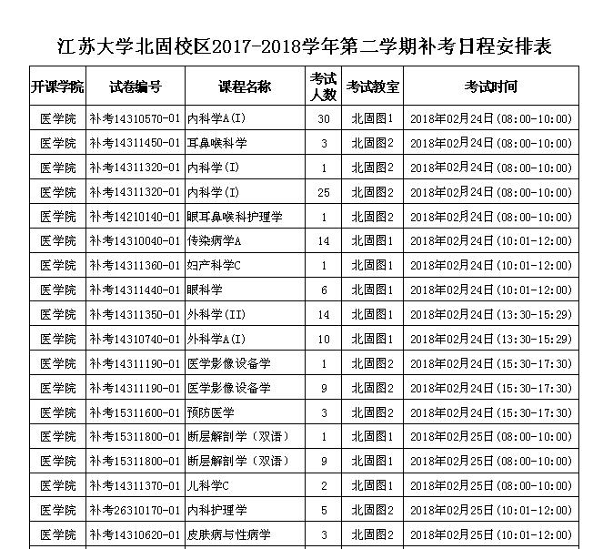 江苏大学北固校区2017-2018学年第二学期补考日程安排表