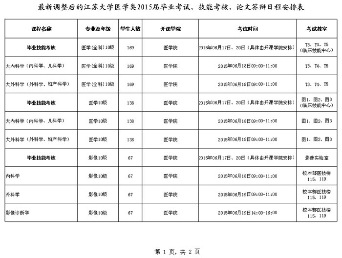最新调整后的江苏大学医学类2015届毕业考试、技能考核、论文答辩日程安排表