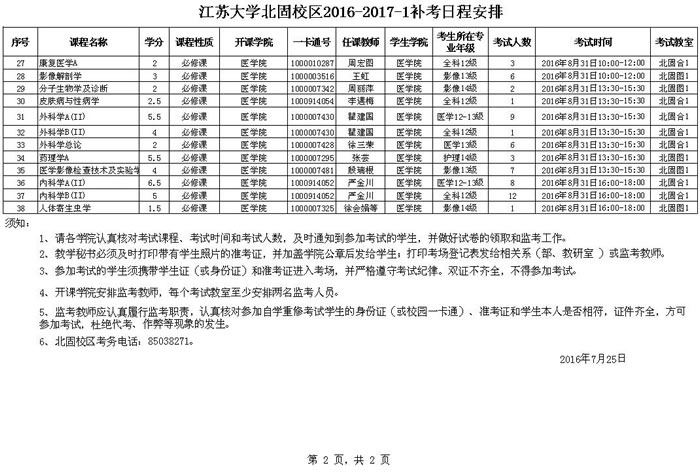 江苏大学北固校区2016-2017-1补考安排