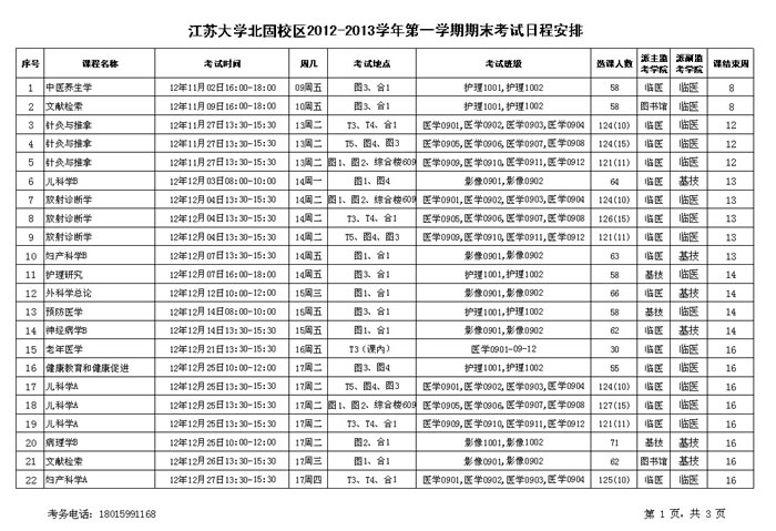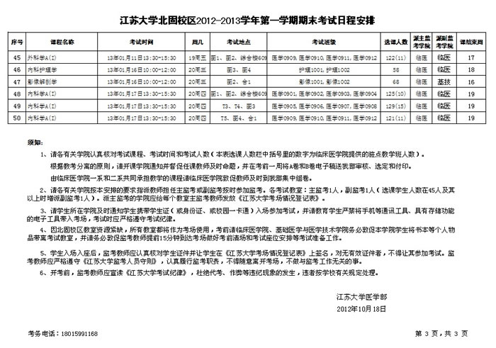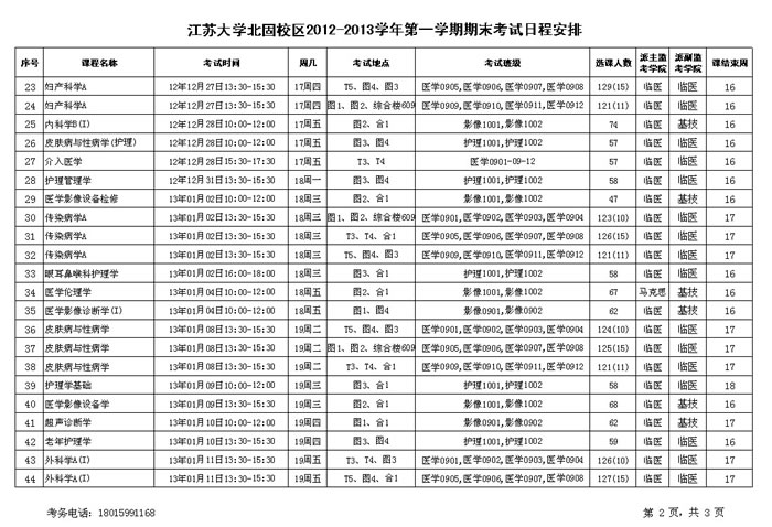 北固校区2012-2013学年第一学期期末考试日程安排