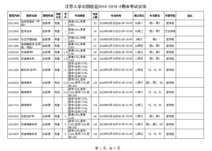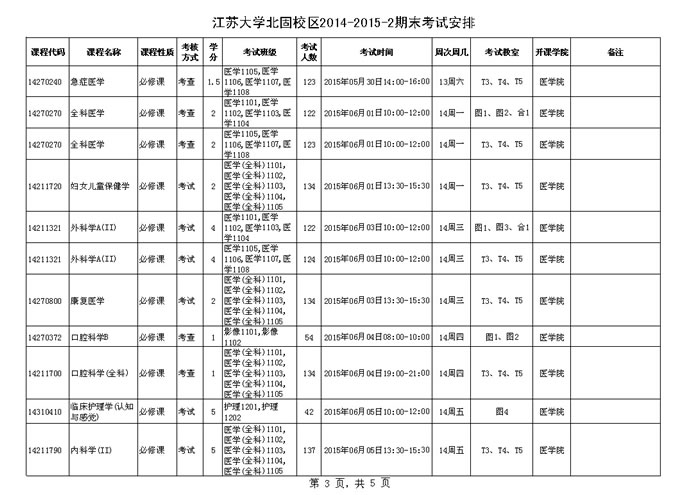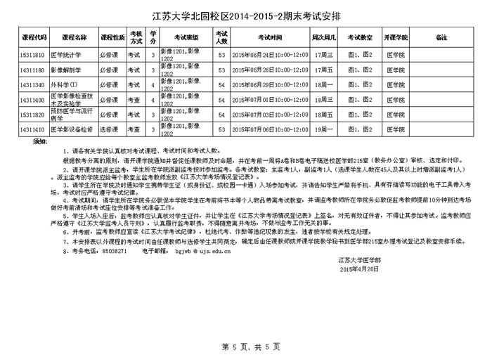 江苏大学北固校区2014-2015学年第二学期期末考试安排