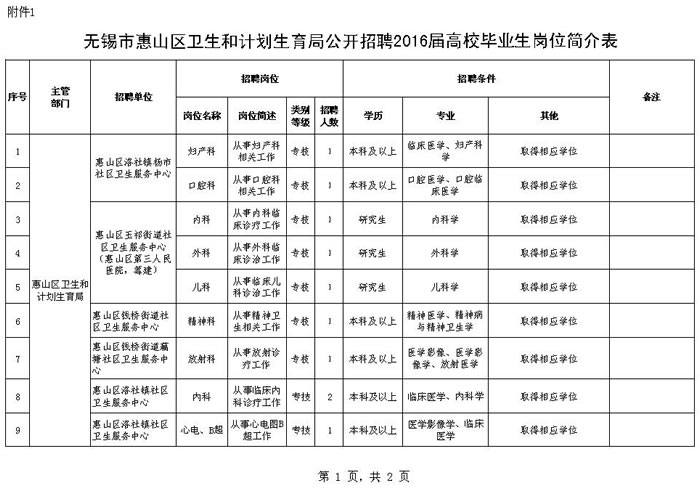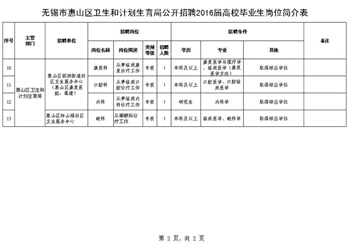 无锡市惠山区卫生和计划生育局公开招聘2016届高校毕业生公告