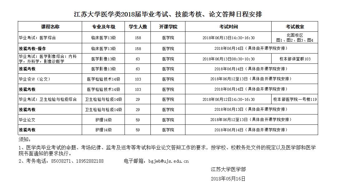 江苏大学2018届医学类毕业考试、技能考核、论文答辩日程安排