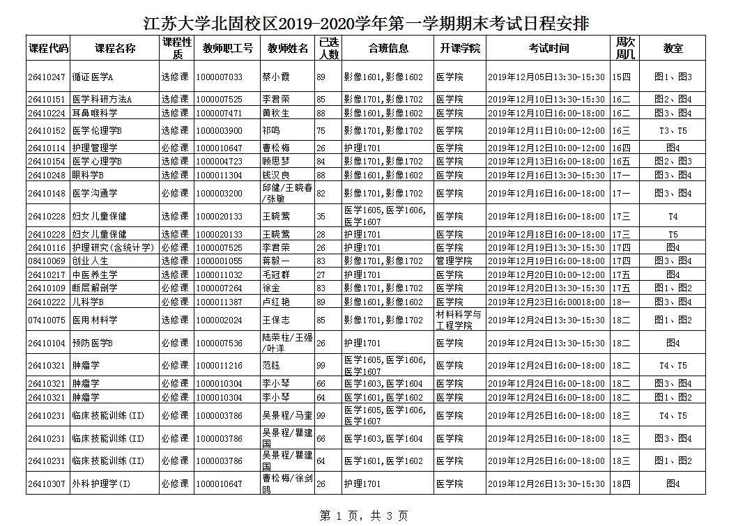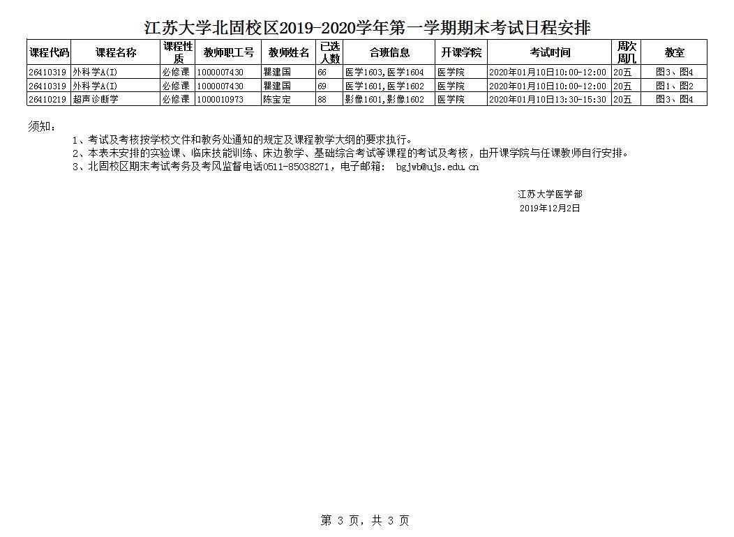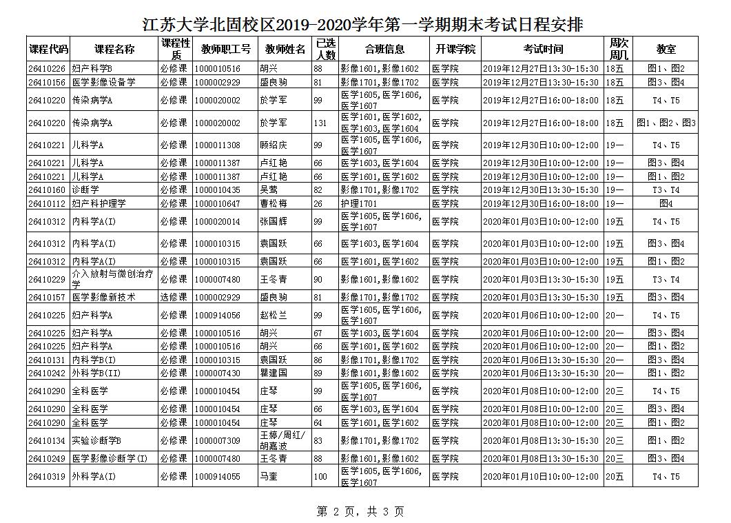江苏大学北固校区2019-2020学年第一学期期末考试日程安排