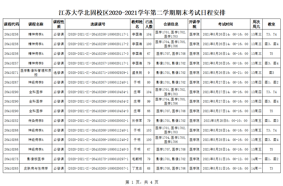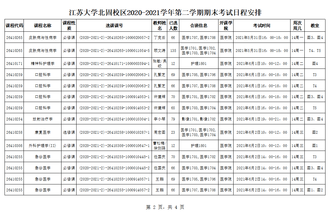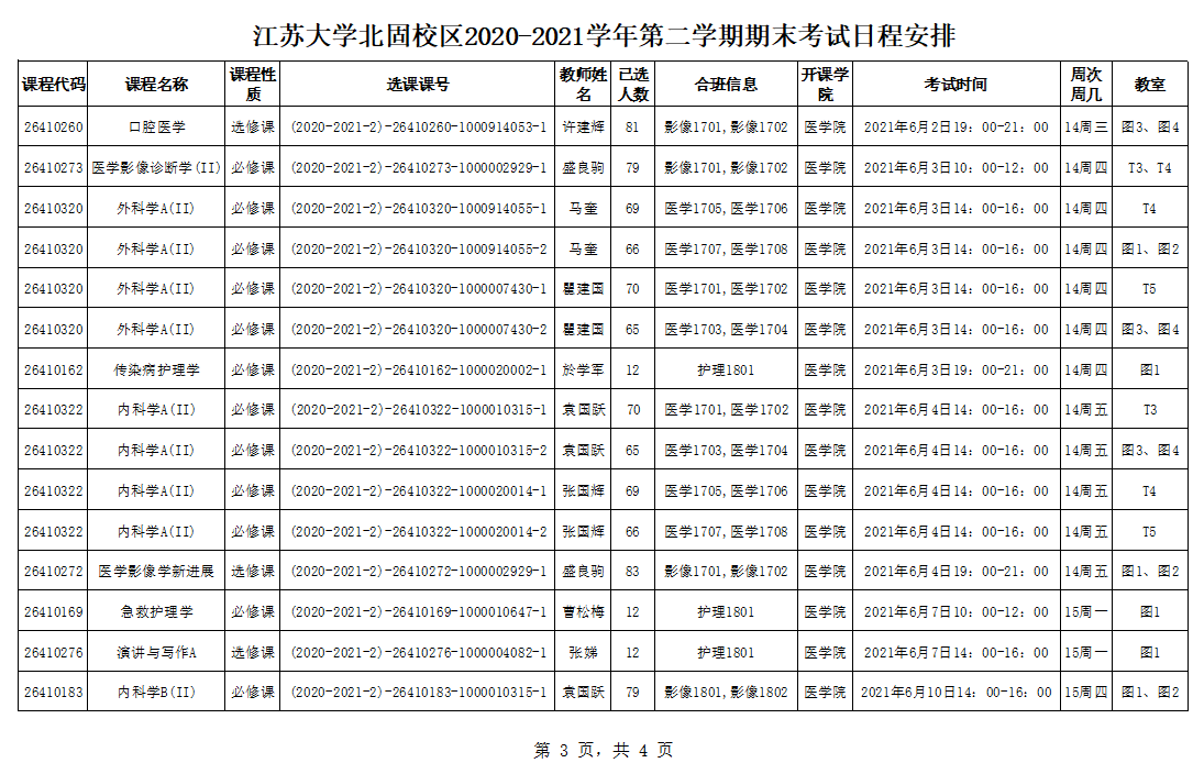 北固校区2020-2021学年第二学期期末考试安排