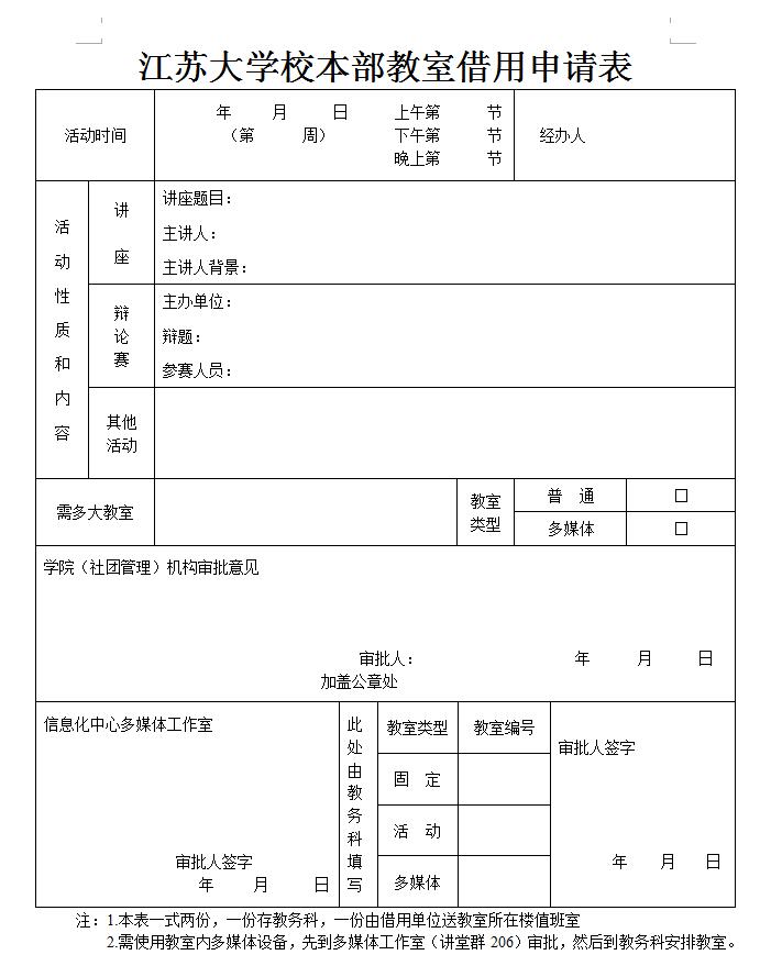 江苏大学校本部教室借用申请表